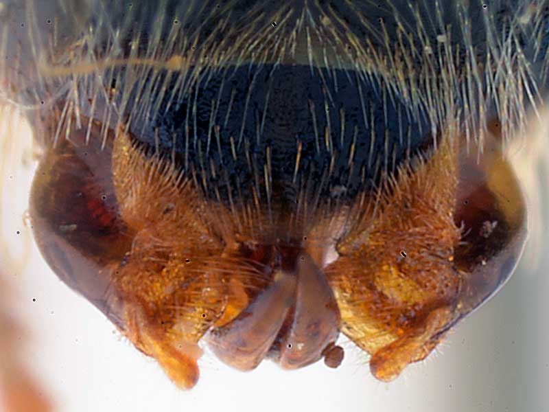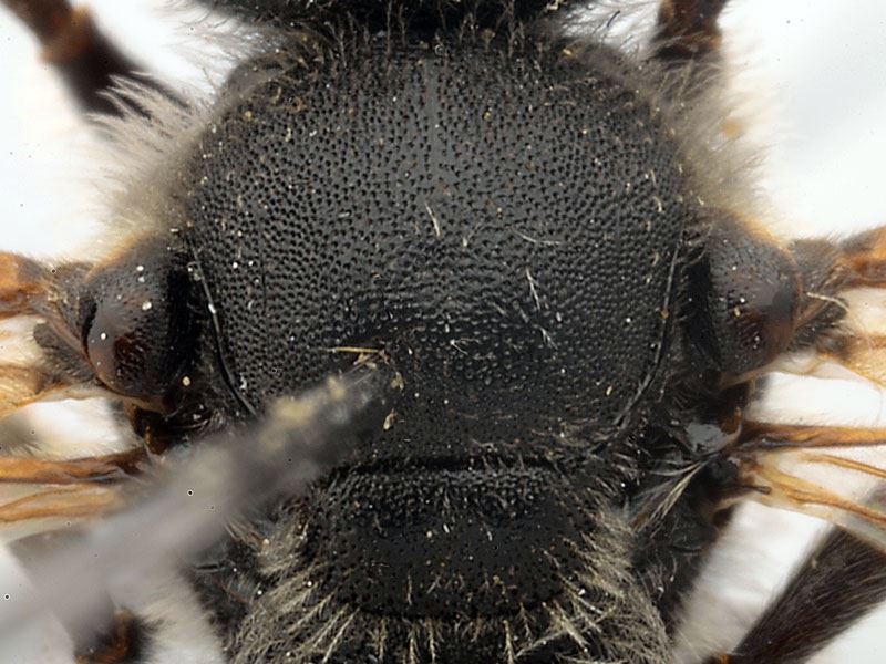 Le mâle a la tête allongée avec une dent sur l'aire malaire, le scutum est à ponctuation dense, les sternites 5 et 6 portent des brosses de soies caractéristiques. Labre subrectangulaire.