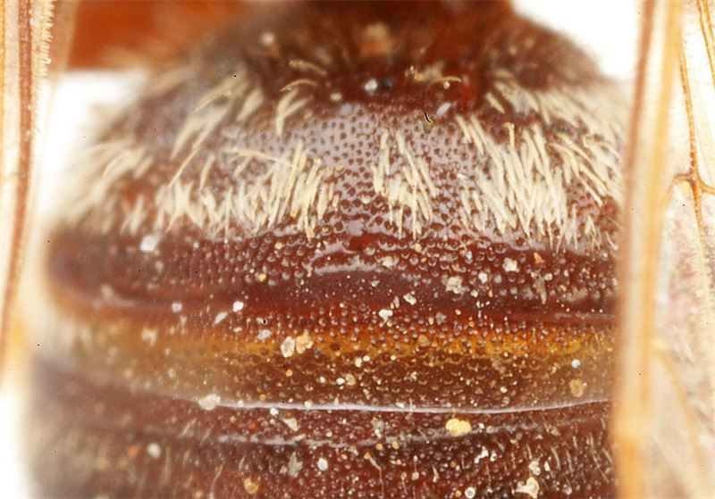 DESCRIPTION. Mâle. Longueur 9 mm. Coloration : Noir avec les deux premiers tergites, les pattes, les tegulae et les antennes orangés. Ailes avec la marge apicale fortemement enfumée. Bandes apicales soyeuses des tergites 3 à 5 dorées. Structure. Patte postérieure torsadée (carène sur la face interne). S5 avec une petite « languette fourchue ». S6 avec une petite bosse centrale et deux latérales. Trochanter des pattes intermédiaires avec une dent dessous à la base. Thorax entre les coxa 1 et 2 sans pointes. Dernier article des antennes fortement dilaté, avant dernier légèrement.