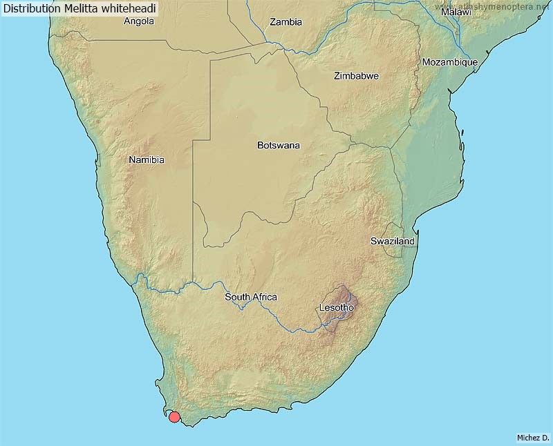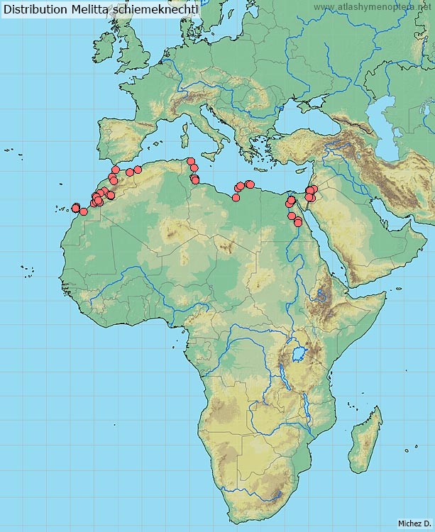 The genus Melitta is recorded in three zoogeographic regions: Ethiopian, Neartic and Palaearctic. Melitta seems to be more diverse in the temperate and Mediterranean climatic regions of the Old World Region, like the Mediterranean Basin, the medio-european valley, the Chinese Sichuan and the south-western region of Africa (Michez & Eardley in press). In the Palaearctic and Nearctic they seem to be missing in the deserts, semi-deserts (e.g. Kyzyl kum), savannah and tropical forest. However, in Africa, M. albida, M. arrogans, M. danae and M. katherinae live in deserts, semi-deserts and/or dry savannah.