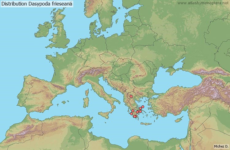 Dasypoda species are common in the Palaearctic region from Morocco to Japan but most species are west-palaearctic (Michez 2002, 2005, Michez et al. 2004a, b). The four subgenera diversity centres are restricted to one of the following Mediterranean peninsula: Balkan, Morocco and Spain. Cycles of repeated expansions and fragmentations of ecosystems during the Quaternary Era could explain these ranges.