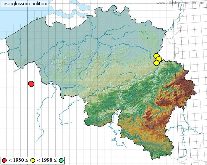 Distribution. Transpalaéarctique, de l’Ibérie jusqu’à l’Oural, vers le nord jusque Berlin et la Belgique. La sous espèce atomarium (Morawitz 1876) [= Lasioglossum politum aramaeum Ebmer 1974] habite l'ouest asiatique: Turquie, Israel, Turkestan, Iran, Egypte. La sous-espèce pekingense (Blüthgen 1925) habite le nord de la Chine et le Japon.