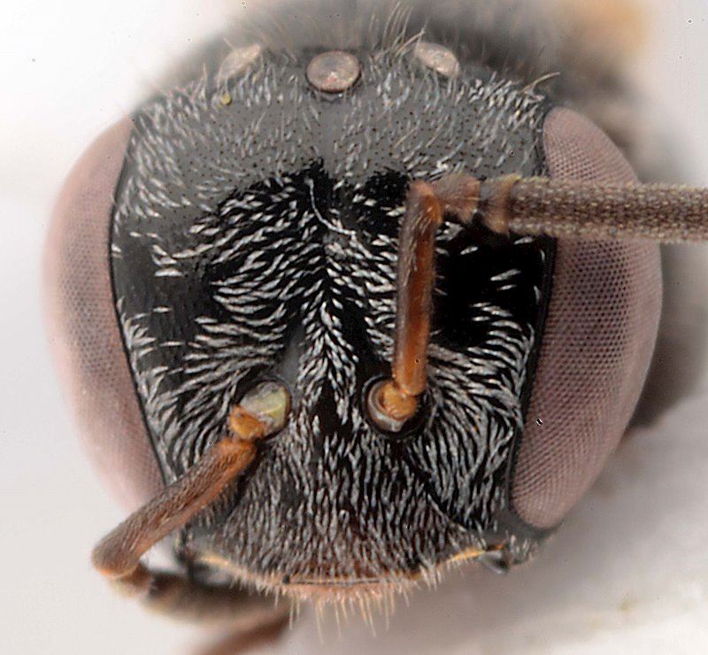 Diagnose. Pattes orangées et pubescence de la face écailleuse (SCAN: ramifiées) comme chez l’espèce précédente. En diffère essentiellement par la taille plus petite. On peut confirmer l’identification par la tête un peu plus étroite, la face mieux creusée entre les sockets antennaires (photo scan), le scutum à ponctuation plus superficielle, plus éparse et un peu moins pubescent (fig. scan), les pleures plus brillantes à ponctuation plus éparse, l’apex du tibias postérieur à angle plus droit (non en s). Ces caractères sont cependant légèrement variables et pas toujours faciles à utiliser. Des séries, provenant de préférence du même nid, sont nécessaires pour bien faire la différence.